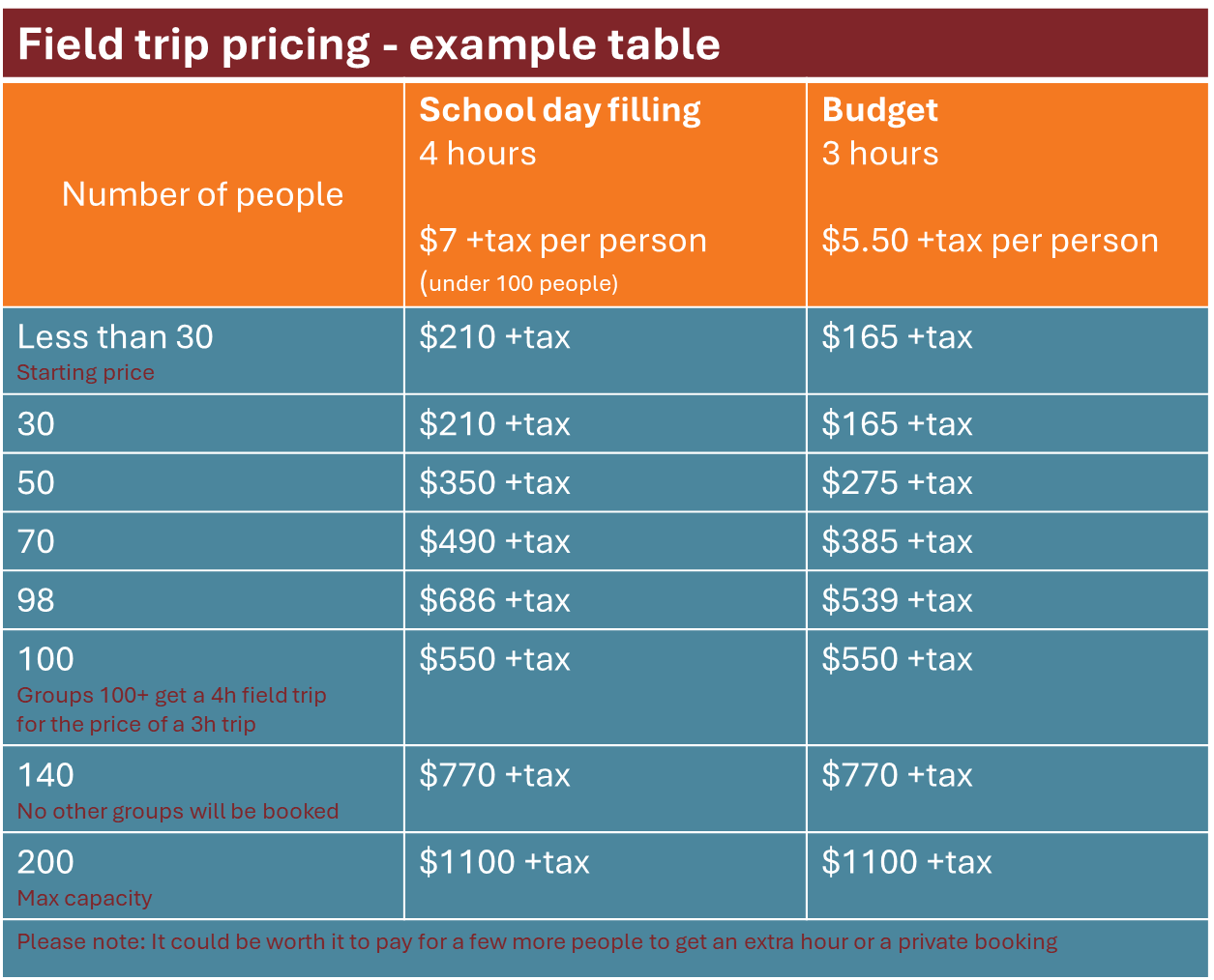 Groups larger than 100 attendees get a 4 hour field trip for the price of a 3 hour field trip.